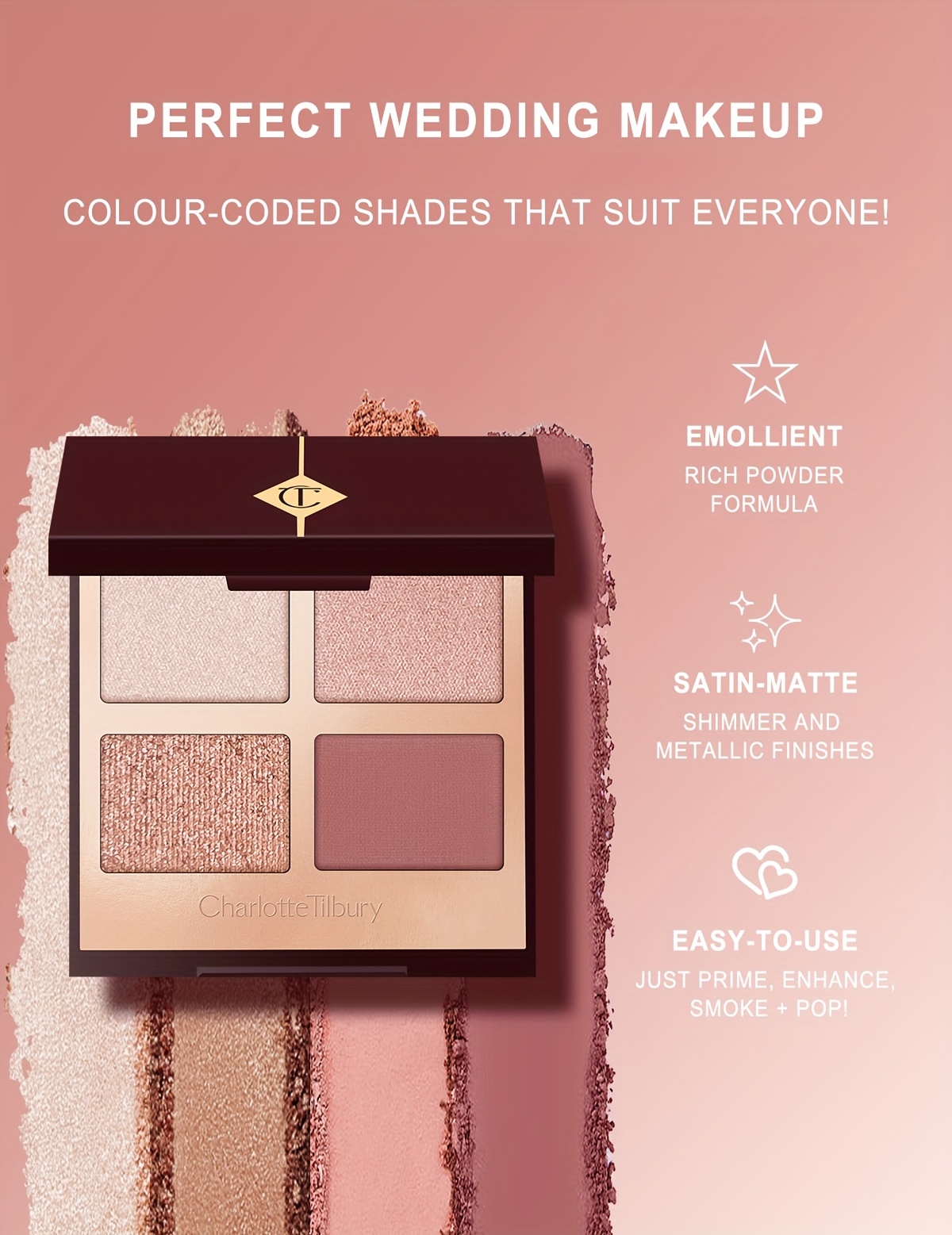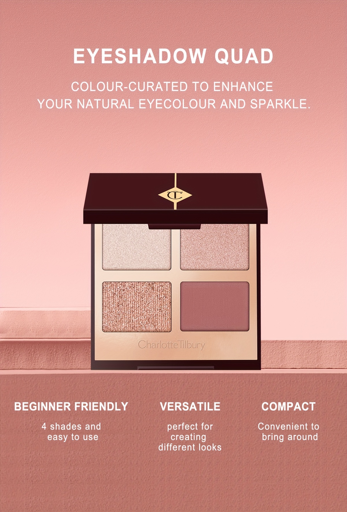 باليت ظلال عيون شارلوت تيلبري Exaggereyes يضم أربعة ألوان متدرجة لإنشاء إطلالة عيون مشرقة ومحددة. يتميز بتركيبة طويلة الأمد وثبات طويل، مع ألوان لامعة يمكن استخدامها كقاعدة أو كهايلايتير. تصميمه المضغوط والفاخر يجعله مثالياً للسفر واستخدامات اليومية والمناسبات الخاصة